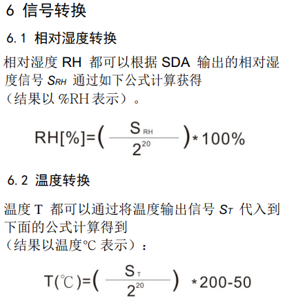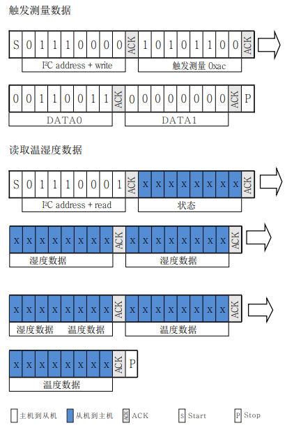 根据AHT10数据手册中5.3节可知,AHT10的触发测量命令为0xac,读取温湿度数据时从机共返回6个字节,第一个字节为从机状态,后5个字节为温湿度信息,主机和从机的数据传输图如下