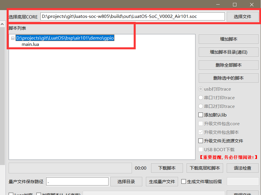 Luatools工具也自动下载了正式版本的一些实例脚本可以在resource\某种型号\某个版本\demo文件夹看到,可以直接选择脚本进行烧录测试