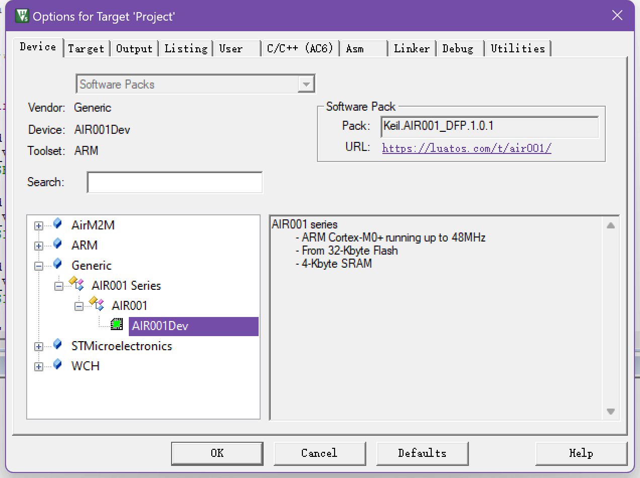 找到PACK文件夹中最新版本的pack文件,双击安装即可,安装后可在keil设备列表的Generic下看到Air001设备。