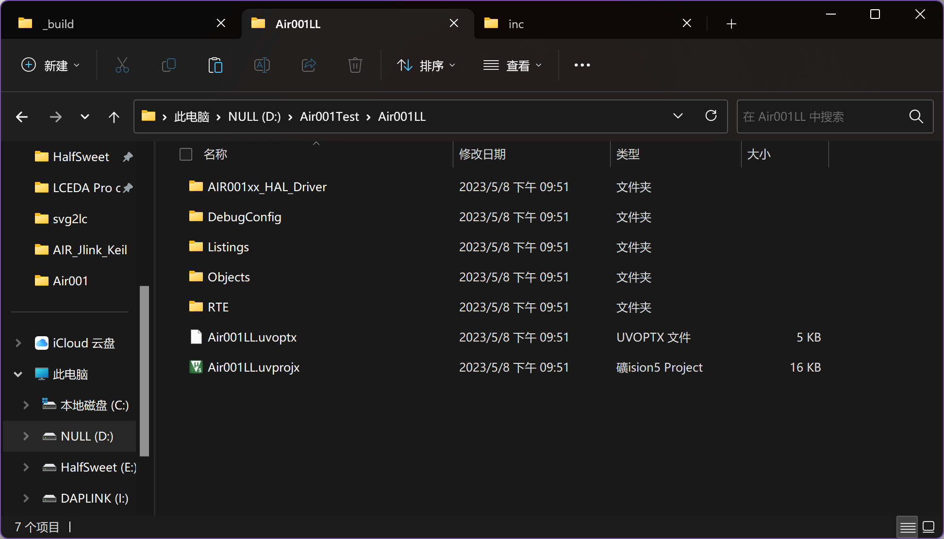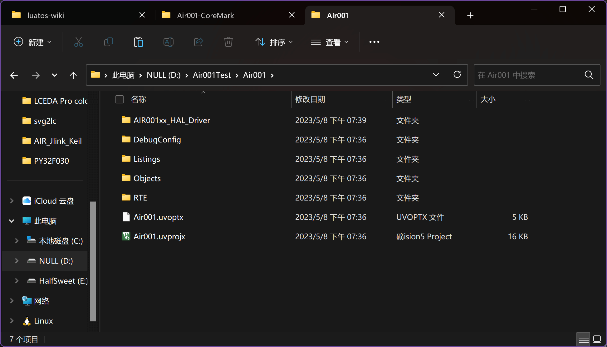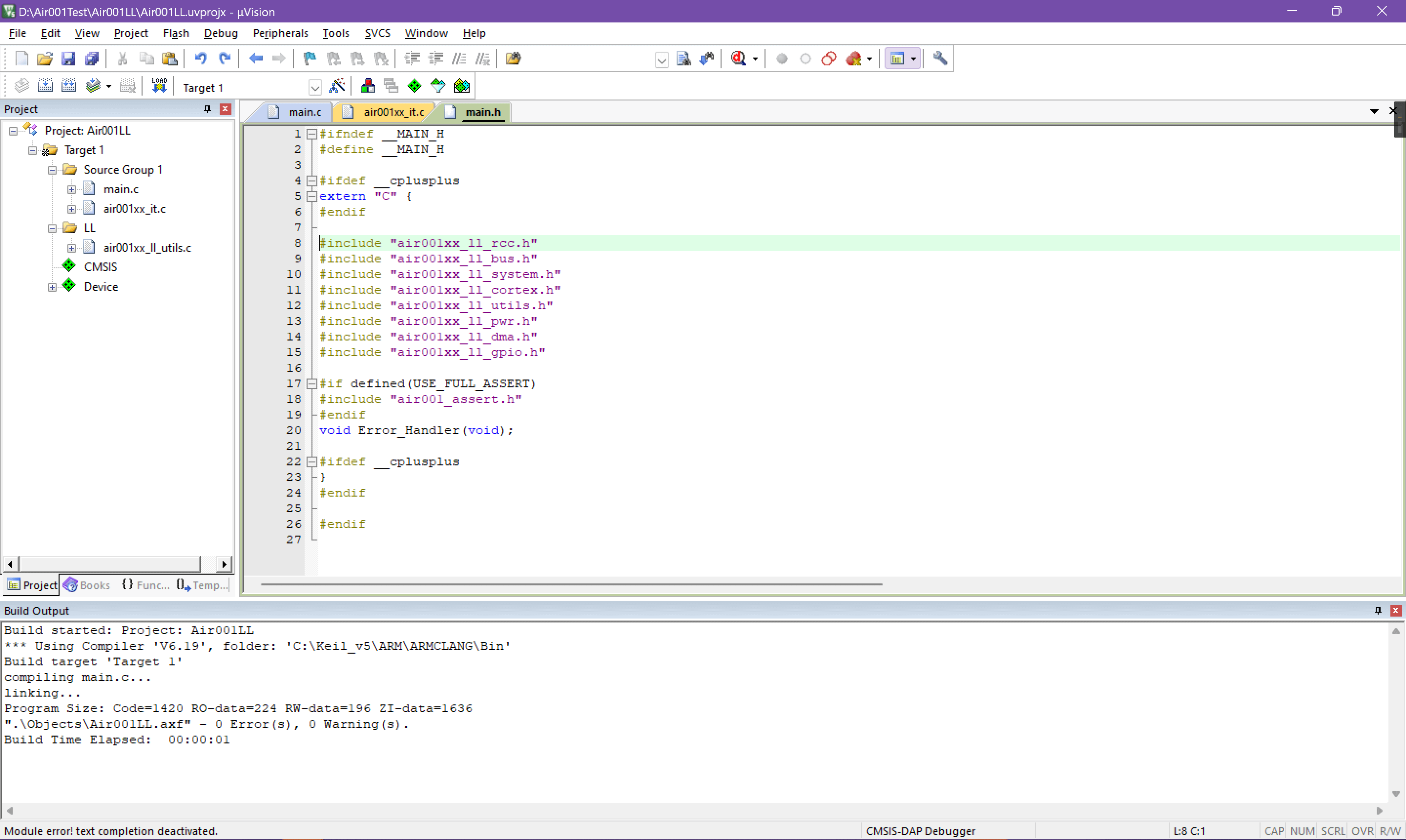 在这里我们使用LL库来作为例子,需要将SDK文件夹中的Libraries目录下的AIR001xx_HAL_Driver文件夹复制在工程目录下,添加完成后的工程目录大概是这样的