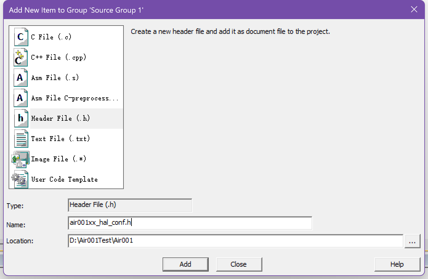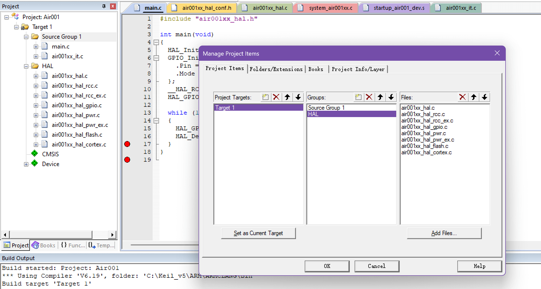 在Keil中添加用到的外设的源文件,一个最小的基于HAL库的工程至少需要添加air001xx_hal_rcc.c、air001xx_hal_rcc_ex.c、air001xx_hal_pwr.c、air001xx_hal_pwr_ex.c、air001xx_hal_cortex.c、air001xx_hal_flash.c、air001xx_hal.c