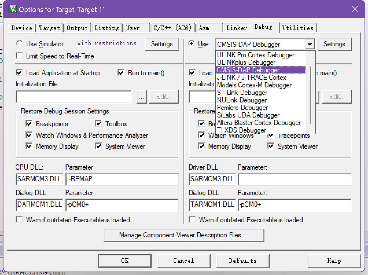 进入 Debug页面,仿真器选择CMSIS-DAP Debugger