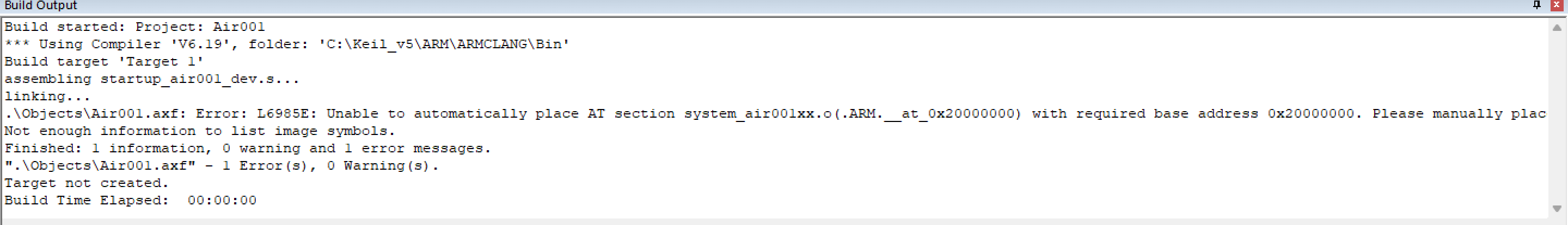 编译出现形如Error: L6985E: Unable to automatically place AT section system_air001xx.o(.ARM.__at_0x20000000) with required base address 0x20000000. Please manually place in the scatter file using the --no_autoat option. 的错误#